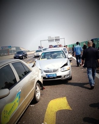按计划9:00在慈城服务区集中队伍,谁想到在观海卫出口附近遇上了高速追尾,嘉兴的28号车与32号车不幸被追尾,只能中途离队。俱乐部工作人员留下两人帮助两位车主处理事故,安排其他车辆接了车上的其他乘客返回了嘉兴。慈城的集中时间推迟了半小时,其余二十六辆车从慈城集中后继续双跳灯前行,11:00顺利在象山出口下了高速。